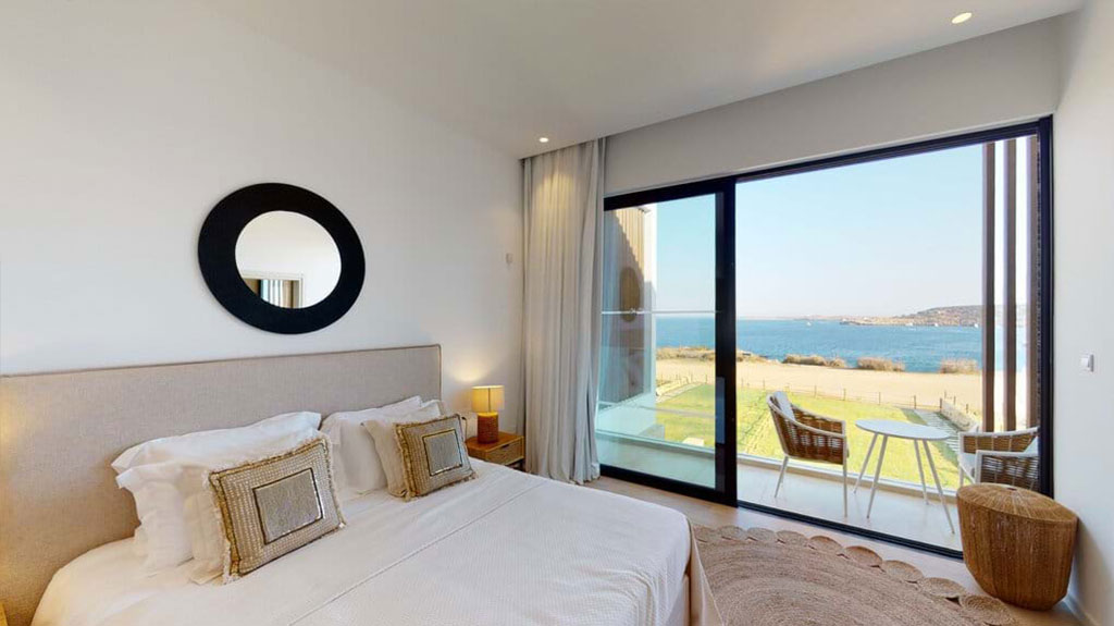 Villa Ourania offers views of the azure waters of Konnos Bay, perfectly complimented by modern interior design that blends seamlessly with the surrounding environment.
